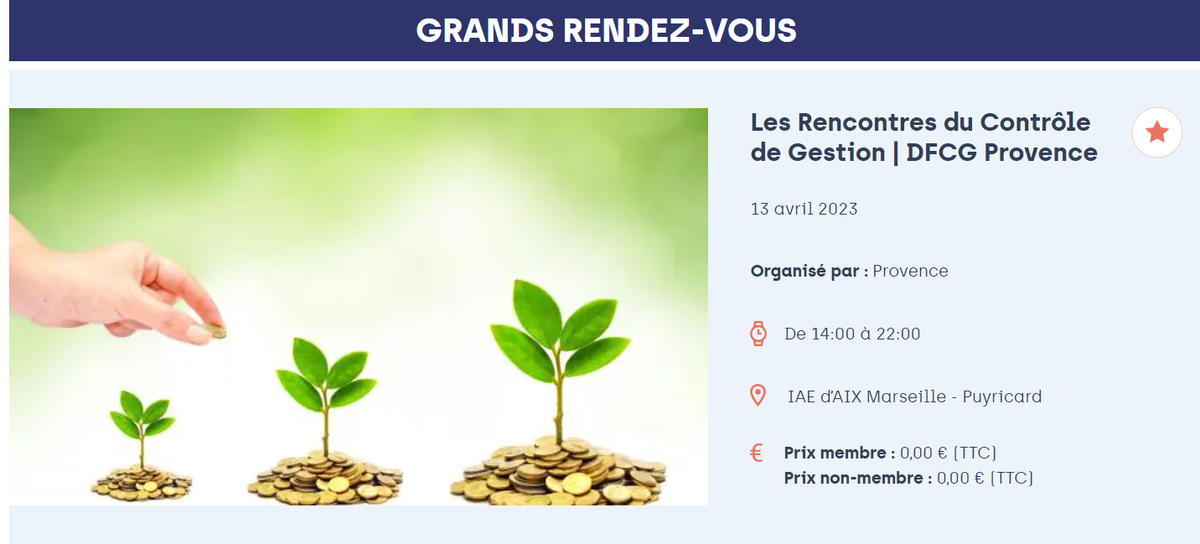 La DFCG Provence est ravie de vous accueillir à la journée du Contrôle de Gestion qui aura lieu en partenariat avec l’IAE d’AIX Marseille le 13 avril 2023 à Puyricard.