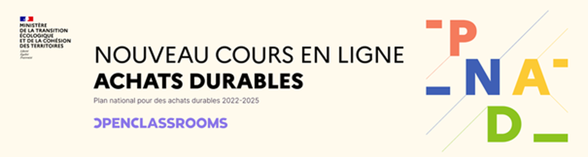Parce que la formation est indispensable à l’appréhension des mécanismes de l’achat durable, le Commissariat général au développement durable, en partenariat avec les ministères impliqués dans la mise en œuvre du Plan national pour des achats durables (PNAD) 2022‑2025, met à disposition des acheteurs publics et privés un MOOC gratuit dédié aux fondamentaux des achats durables sur la plateforme OpenClassrooms.